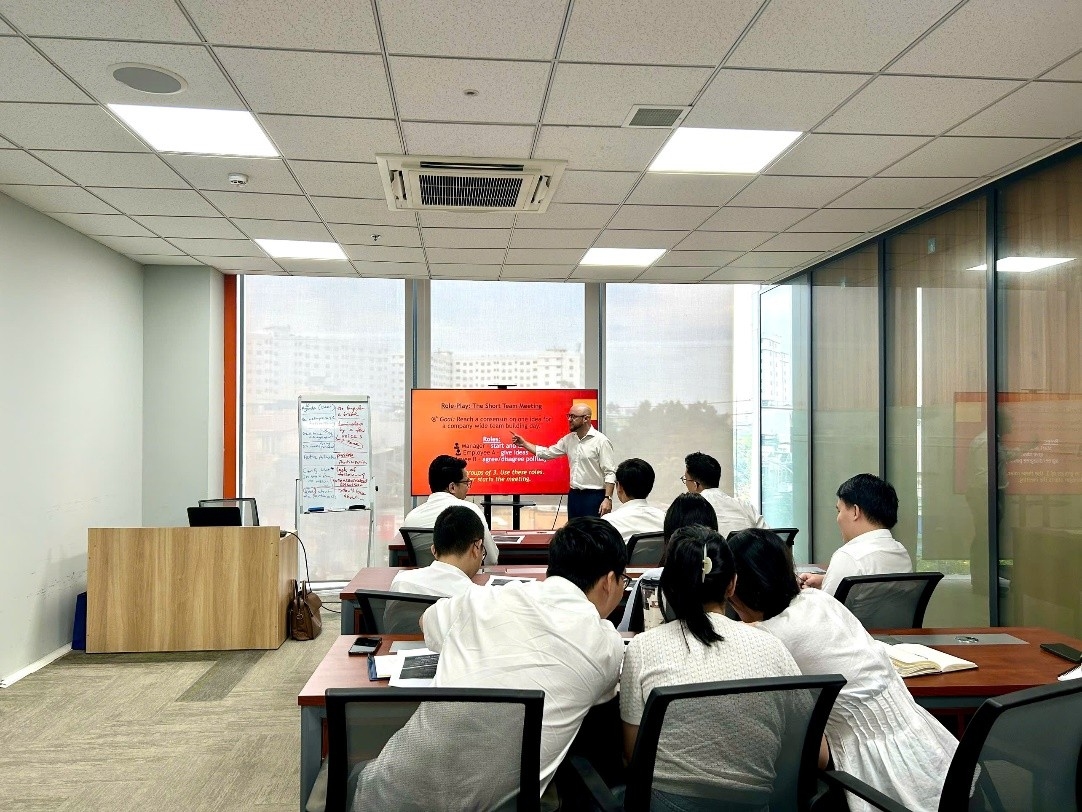Tham gia tích cực vào các cuộc họp: Anh chị học viên được thực hành các mẫu câu tiếng Anh để mở đầu, điều phối thảo luận, trình bày quan điểm, cũng như đồng thuận hoặc phản đối một cách lịch sự và chuyên nghiệp. Hoạt động “nhập vai” sinh động giúp người học luyện tập khả năng diễn đạt tinh tế, kiểm soát ngữ điệu và thể hiện sự tôn trọng đối tác trong quá trình trao đổi.