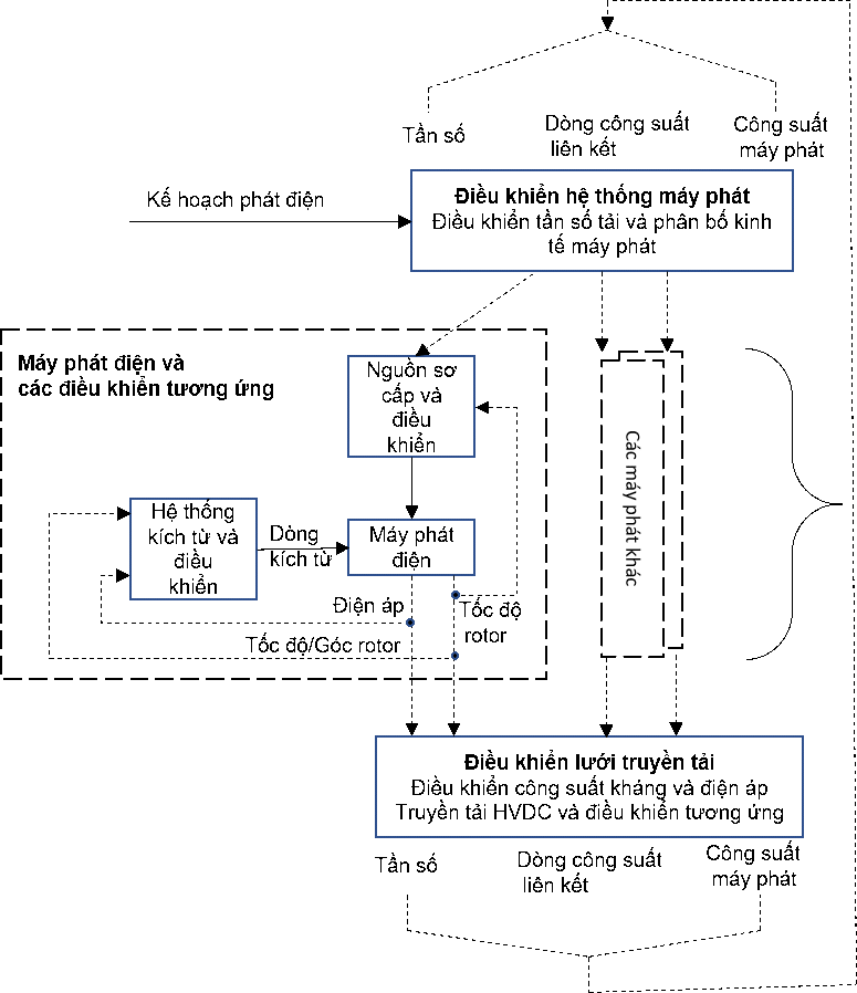 Ta có thể thấy các vòng điều khiển tồn tại ở các phần tử và các lớp khác nhau trong hệ thống điều khiển, từ phần tử máy phát đến lưới truyền tải, từ lớp các khu vực tại chỗ (subsystem) cho đến lớp hệ thống (whole system). Mỗi phần tử và mỗi lớp lại có các vòng điều khiển ứng với các chức năng điều khiển khác nhau. Như vậy, yếu tố “điều khiển” tồn tại ở mọi phần tử, mọi lớp trong hệ thống điện.