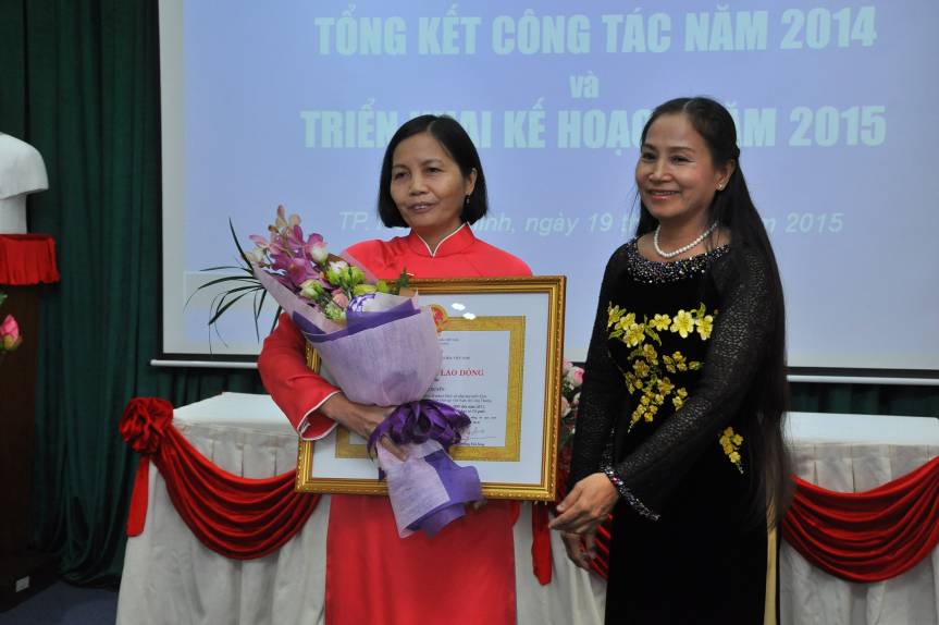 Bà Nguyễn Thị Ngọc Trang - Cục phó Cục Công tác phía Nam, Bộ Công Thương trao tặng Huân chương Lao động hạng Ba cho bà Phí Thị Xuyến, Phó Trưởng phòng Kế hoạch Vật tư thuộc Xí nghiệp Khảo sát tổng hợp miền Nam