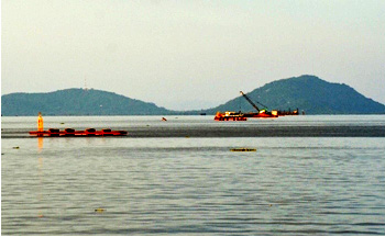 Thi công đường dây 22 kV trên không vượt biển đưa điện ra đảo Hòn Tre - Ảnh: X.Tiến