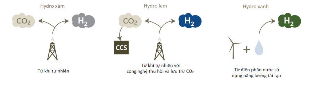 Tùy vào phương pháp sản xuất, hydro có thể được phân loại thành 3 nhóm như sau: grey hydrogen (hydro “xám”), blue hydrogen (hydro “lam”) và green hydrogen (hydro “xanh”). Trong đó, hydro xám và hydro lam đều được sản xuất từ phương pháp nhiệt hóa khí tự nhiên. Tuy nhiên quá trình sản xuất hydro xám cũng đi kèm với phát thải CO2 còn hydro lam sẽ trải qua quá trình thu hồi và lưu trữ CO2 (Carbon Capture and Storage – CCS). Hydro xanh là sản phẩm thu được từ quá trình điện phân nước bằng năng lượng tái tạo thân thiện với môi trường.