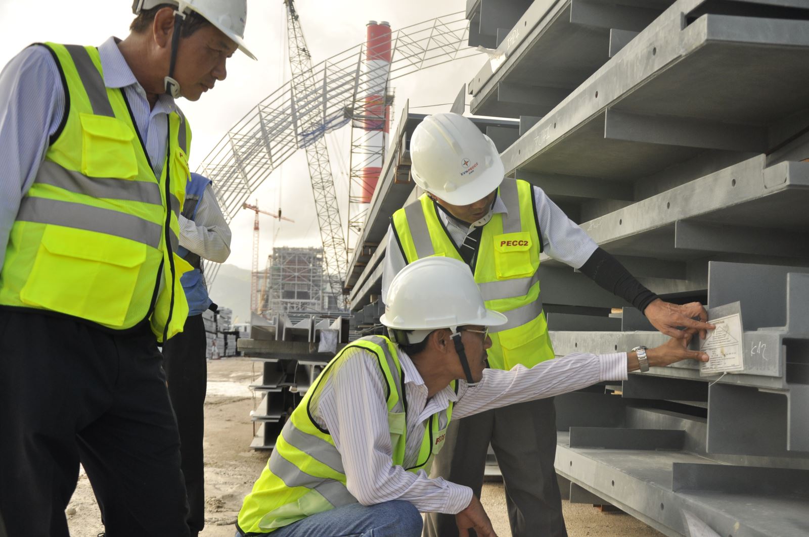 Kỹ sư Xí nghiệp Cơ điện kiểm tra shipping mark trên kết cấu thép tại bãi tập kết kết cấu thép công trường Vĩnh Tân 4