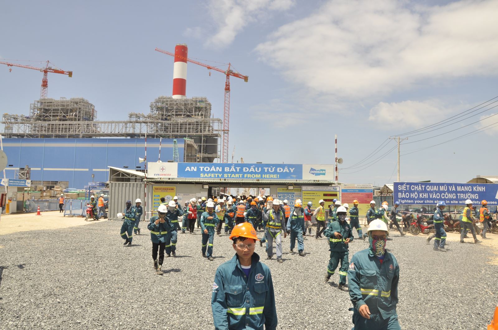 Có mặt trên công trường Vĩnh Tân 4 vào giữa trưa, chúng ta còn có thể cảm nhận được nhịp sống hối hả khi lực lượng nhân công nhà thầu nối đuôi nhau di chuyển ra khỏi công trường vào giờ ăn trưa, tranh thủ nghỉ ngơi ít phút trước khi tiếp tục công việc buổi chiều.