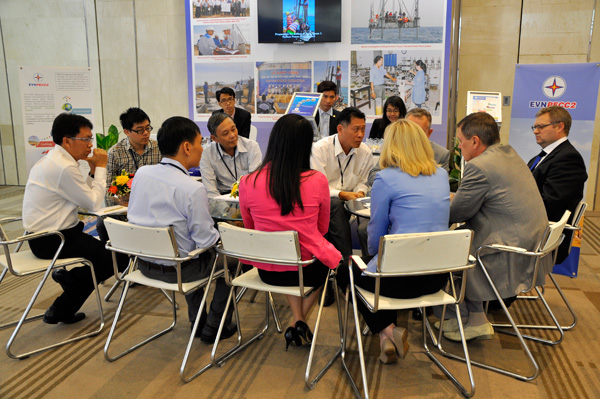 Ông Nguyễn Cường Lâm (áo trắng – giữa), (Phó tổng giám đốc EVN, trưởng ban quản lý dự án điện hạt nhân Ninh Thuân cùng đối tác Rosatom và PECC2 trao đổi công việc tại gian triển lãm của PECC2