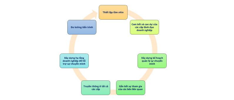 “Hoóc-môn khơi mào” để kích hoạt quá trình “lột xác” của doanh nghiệp chính là tầm nhìn của Lãnh đạo cấp cao. Từ đó, vòng đời của quá trình chuyển mình được vận hành như minh họa ở hình 1.
