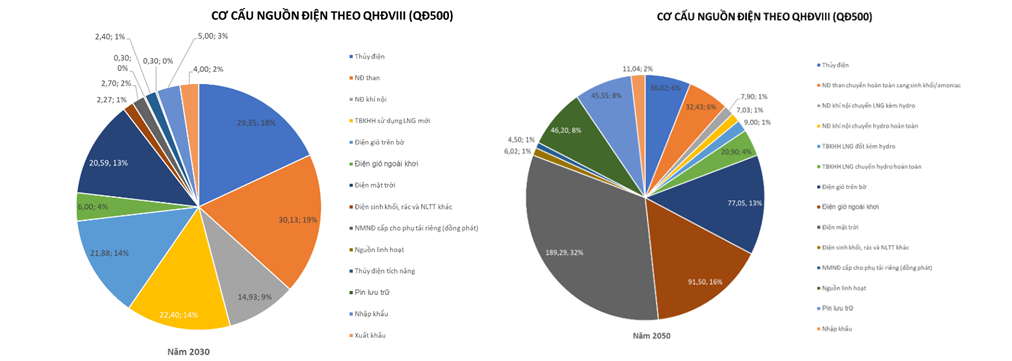 Hình 1. Cơ cấu các nguồn điện Việt Nam theo Quy hoạch điện VIII vào năm 2030 và năm 2050 [8].