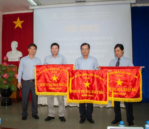 Đại diện TLĐ, TNĐ và XNKS nhận cờ Thi đua Xuất sắc năm 2012 của EVN